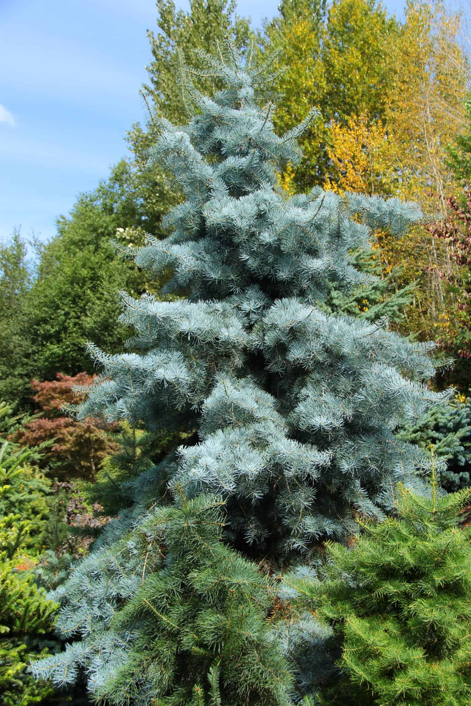 Blue Cloak White Fir A dense narrow pyramidal concolor fir with gracefully hanging side branches. Powder blue needles and light green-blue new growth give a very soft look. Hardiness Growth Rate Esposure HxW@10yrs Zones 4-8 Intermediate Sun/Part Shade 8’x2.5′